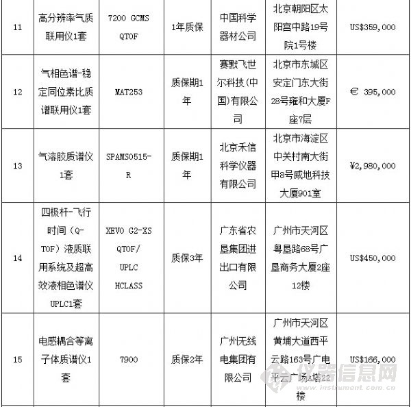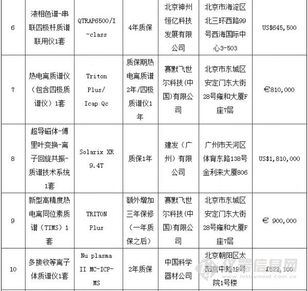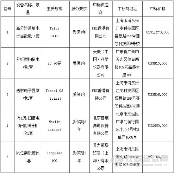 近日,中国科学院2015年仪器设备部门集中采购项目(第一批)中标结果公布。本次项目共计采购18套高端分析仪器,其中含12套质谱、4套电镜、1套激光扫描共聚焦显微镜及1套氨基酸分析仪,最终中标金额共计6550万。 值得注意的是,本次采购的18套仪器中有17套允许采购进口品牌投标,但有一套气溶胶质谱仪则限定为国产品牌。编辑曾估测广州禾信的质谱产品会中标,果不其然,广州禾信的SPAMS0515-R质谱产品以298万元的价格中标。 此外,赛默飞、珀金埃尔默、沃特世、安捷伦、布鲁克、SCIEX、FEI、日立等仪器大牌均在中标名单中。 具体中标结果如下: 采购项目名称:中国科学院2015年仪器设备部门集中采购项目(第一批) OITC-G15032179 采购人名称:中国科学院各研究所 采购代理机构全称:东方国际招标有限责任公司 采购数量:1套 采购用途:科研 定标日期:2015年6月19日 招标公告日期:2015年5月19日 中标结果: