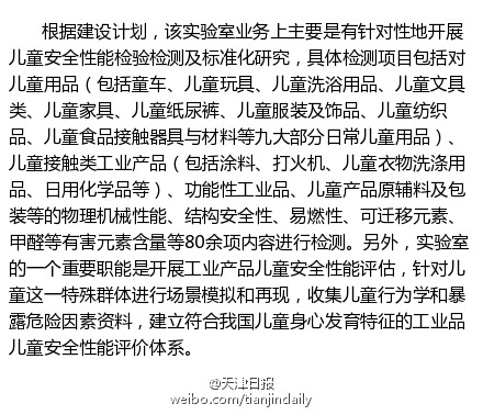 “六一”儿童节前夕,国家质检总局批复了天津检验检疫局关于筹建“国家质检总局工业产品儿童安全检测区域性中心实验室(天津)”的申请。建成后,将成为天津市乃至我国北方地区第一个专业从事工业产品儿童安全检测的综合实验室。