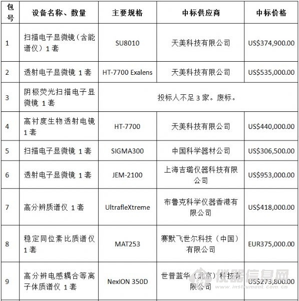 6月24日,中科院2015年仪器设备部门集中采购项目(OITC-G15023229)中标结果公布,中标金额为3838万元,采购了9套质谱、3套透射电镜、2套扫描电镜,中标品牌同样悉数大牌,如布鲁克、赛默飞、安捷伦、珀金埃尔默、SCIEX、日本电子、日立等。 在本次采购内容中包括一套气溶胶质谱仪,但因为投标厂商不足3家出现废标。而早在五天前(19日),中科院2015年仪器设备部门集中采购项目(OITC-G15032179)中的一套气溶胶质谱仪由广州禾信中标。该批次中标金额为6550万,采购了12套质谱、4套电镜,中标仪器品牌包括赛默飞、珀金埃尔默、沃特世、安捷伦、布鲁克、SCIEX、FEI、日立等。 下面让我们来围观一下这个让各个仪器大牌悉数登场的1.04亿仪器采购项目: 中科院2015年仪器设备部门集中采购项目(OITC-G15023229)