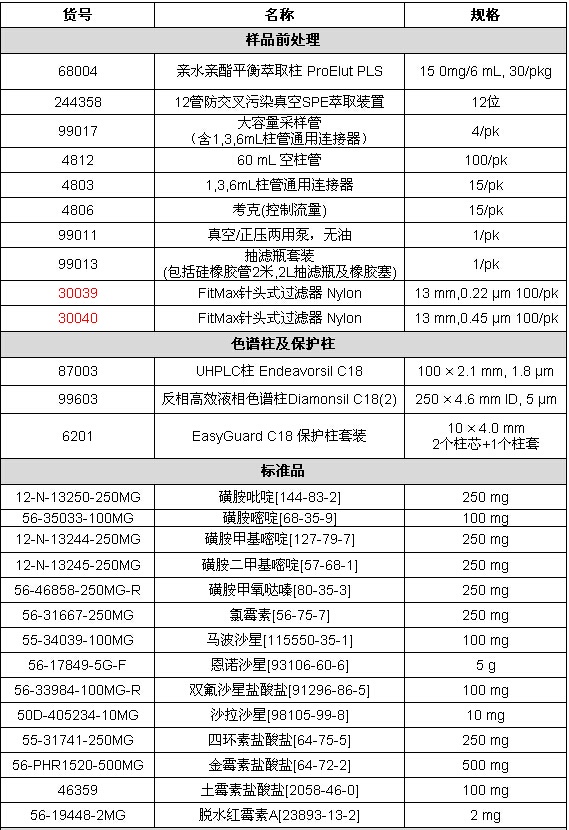 水中抗生素药物检测相关产品信息货号