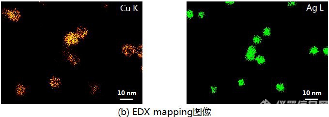 上图即为银铜纳米颗粒的BFSTEM画像和DFSTEM图像。 从BFSTEM画像可看出颗粒大小约为10 nm,高对比度观察下可确认颗粒的分布形式,即2个颗粒相邻或核-壳型分布。此外,从DFSTEM画像的Z对比度可看出银和铜是可以分离存在的。 图(a)是纳米颗粒的DFSTEM图像,图(b)是图(a)视野下的EDX mapping结果。从mapping图像可看出,DFSTEM图像不仅能确认颗粒的位置,还能区分出银和铜。DFSTEM图像中亮度高地颗粒是银,亮度低的颗粒是铜。