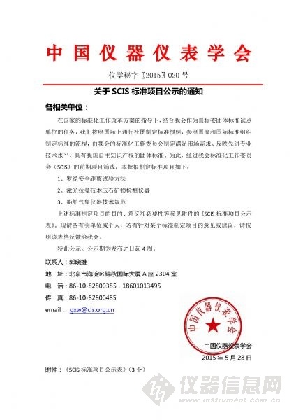 关于SCIS标准项目公示的通知 各相关单位: 在国家的标准化工作改革方案的指导下,结合我会作为国标委团体标准试点单位的任务,我们按照国际上通行社团制定标准惯例,参照国家和国际标准组织制定标准的流程,由我会的标准化工作委员会制定满足市场需求、反映先进专业技术水平、具有我国自主知识产权的团体标准。为此,经过我会标准化工作委员会(SCIS)的前期项目筛选,本批拟制定标准项目如下: 1、罗经安全距离试验方法 2、激光拉曼技术玉石矿物检测仪器 3、船舶气象仪器技术规范 上述标准制定项目的目的、意义和必要性等参见附件的《SCIS标准项目公示表》。现请各有关单位或个人,若有针对某个标准制定项目的意见或建议,请按照该表格反馈给我会。 特此公示。公示期为发布之日起4周。 联系人:郭晓维 地 址:北京市海淀区锦秋国际大厦A座2304室 电 话:86-10-82800385,18601013495 传 真:86-10-82800485 email: gxw@cis.org.cn 中国仪器仪表学会 2015年5月28日 附件2: 《SCIS标准项目公示表-激光拉曼技术玉石矿物检测仪器》
